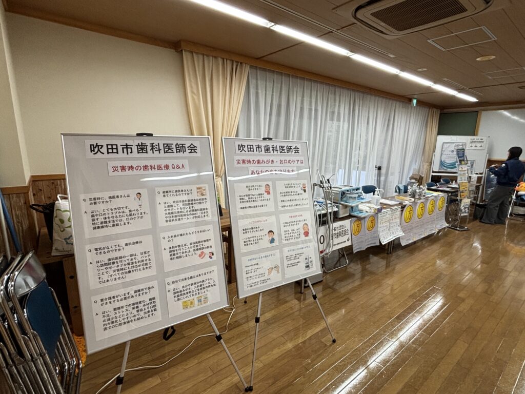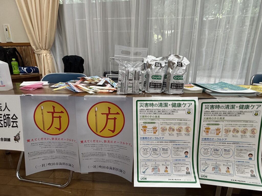 その一つとして、毎年行われている吹田市地域防災総合訓練に参加することにいたしました。出展ブースにて防災に対する準備物や口腔ケアの方法などを記したパンフレットを参加者にお渡しし説明させていただきました。参加者の方たちは、防災に対する意識が高い方が多く、防災バッグに歯ブラシを入れていると答えていただいた方が多くおられました。ただ、家族分必要ですよということをお伝えすると、人数分入っていたかわからんなとおっしゃっていた方が少なからずおられました。