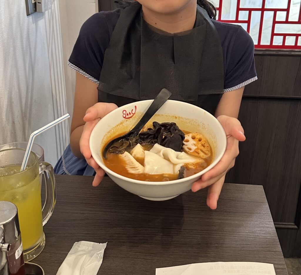 しばらくして、寒くなってきた11月に、外食する機会があったので、また娘と別の麻辣湯を食べに行くことにしました。今度のお店は、西梅田のディオスマーラータンです。このお店は、サラダバーのように自分で具材を好みの量取るスタイルで、具材のチョイスも迷うし、どれくらい入れるかもすごく迷いました。辛さは選べなかったんですが、調味料コーナーに辛い調味料を取りに行って、席で出来上がりを待ちました。ある程度野菜を入れたつもりだったんですが、茹でると小さくなってしまって、もうちょっと入れたらよかったなと後悔しました。味は、辛さ控えめで、結構まろやかな感じでした。器の底に辛い部分が溜まっていたのか、かき混ぜると辛さが出てきました。もう少し辛さが欲しかったので、辛い調味料を足して食べました。このお店も美味しかったですが、具材の量を決めるのが難しいのと、卓上に調味料がないのが、自分としてはマイナスポイントでした。良いところとしては、娘は学割で注文できて、300円くらい安くしてもらえてラッキーでした。娘は、こっちの麻辣湯が好みだったそうです。