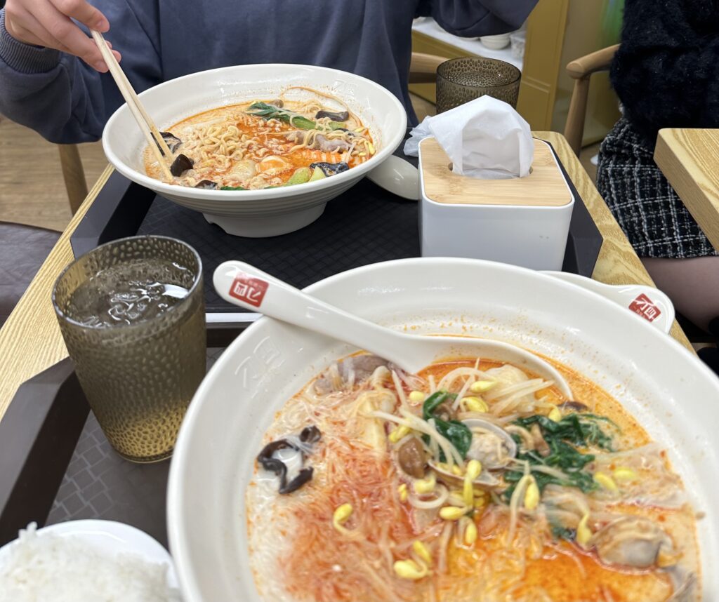 具材は自分で取りに行くタイプではなく、好きな具材を注文し、スープの種類や辛さを選ぶことができました。味はスッキリ辛い感じで、火鍋とチゲ鍋を足して2で割ったような印象でした。テーブルには、黒酢などの調味料がたくさん置かれていて、途中で味変したりして、いろんな味を楽しむことができました。そこまで期待していなかったんですが、とても美味しくて、また行きたいなと思ったと同時に、他のお店の麻辣湯も気になりました。
